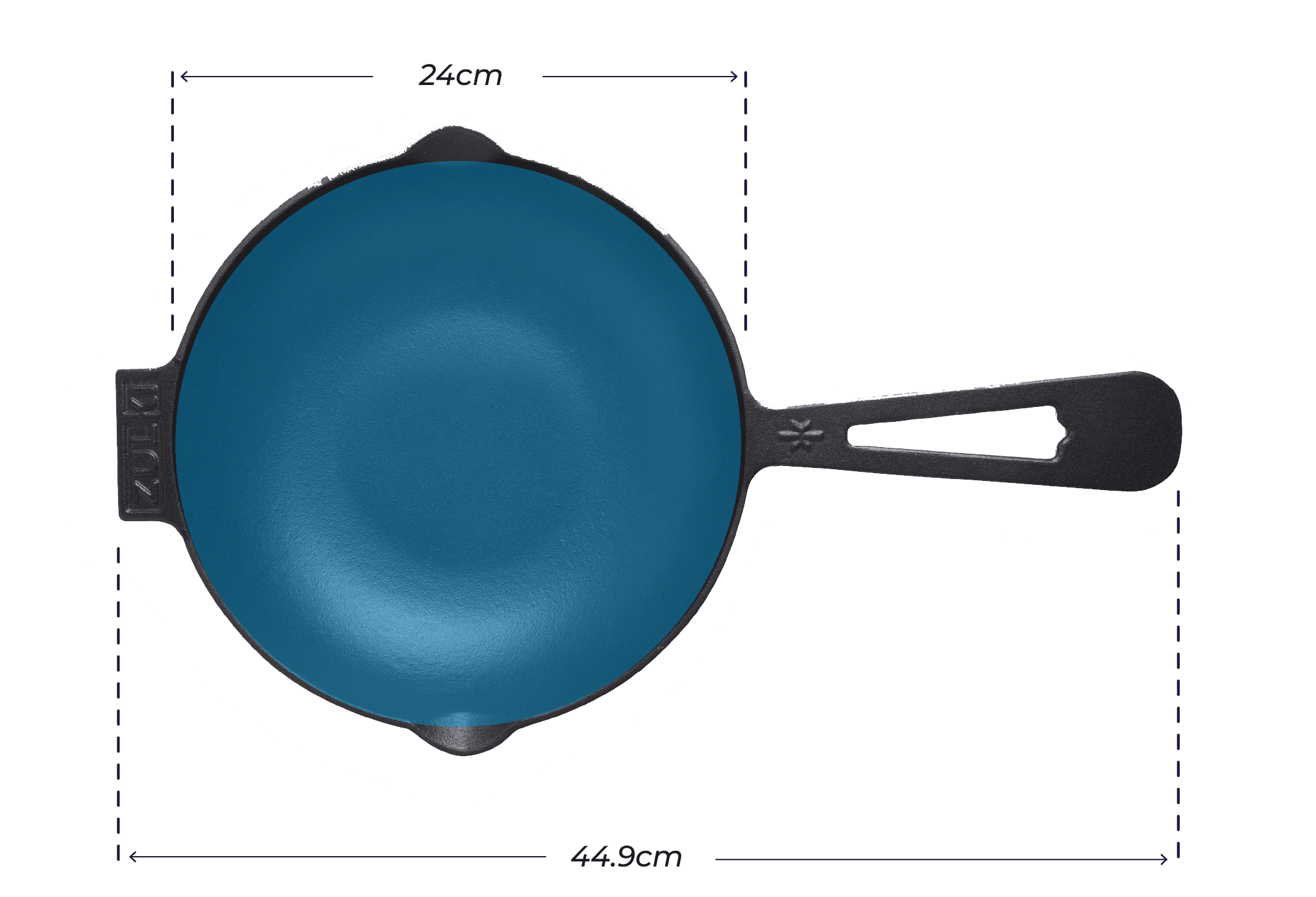 Fabricada en hierro fundido y recubierta con esmalte cerámico, combina lo mejor de dos mundos: la durabilidad y retención térmica del hierro, con las propiedades antiadherentes y de bajo mantenimiento que ofrece la cerámica. Este recubrimiento permite cocinar sin preocuparte por oxidaciones ni curados frecuentes, manteniendo un contacto seguro y saludable con los alimentos.